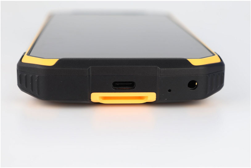 Sur la tranche supérieure, il y a un rabat en caoutchouc qui protège la connexion de l’antenne radio. Au bas de l’appareil, vous trouverez le port USB-C pour recharger la batterie et une prise casque. Les deux ports de connexion ne sont pas protégés par des rabats en caoutchouc, mais cela ne pose pas problème. Même après avoir plongé le Blackview BV9500 Pro dans l’eau la connectique fonctionnée. Par contre les poussières et autres micro particules peuvent pénétrer à l’intérieur. Le haut-parleur multimédia est placé à l’arrière sur la partie inférieure.