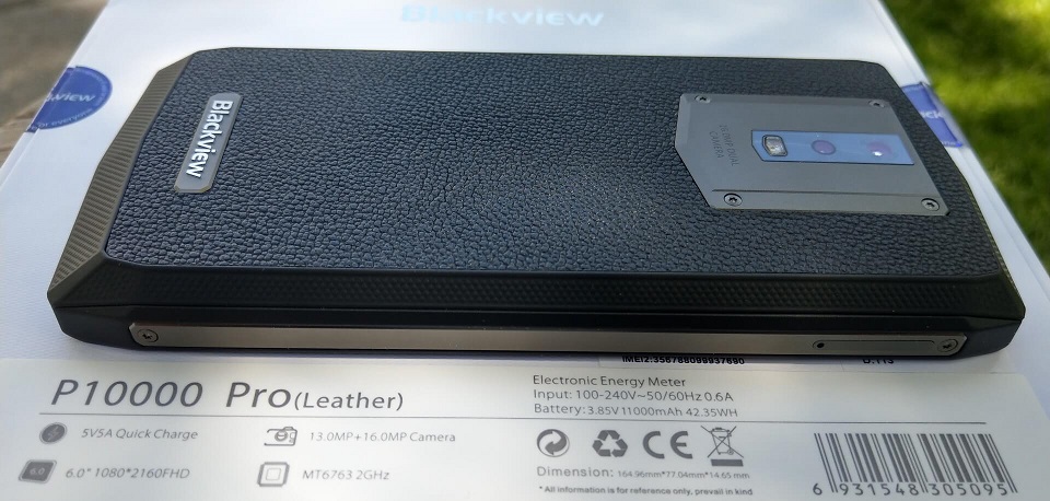 La dalle est protégée par un verre, mais Blackview n’a pas précisé ses spécifications. L’écran Full HD de 6 pouces est entouré par des bords noirs, ce sont ceux du haut et du bas qui sont les plus épais. Sur la partie supérieure de l’écran, il y a une caméra, une LED de notification et des capteurs. Il n’y a aucun bouton ou fonction intégrée sur le bord du bas. Le cadre du téléphone est fabriqué en aluminium, les boutons de volume et d’alimentation sont intégrés sur la tranche droite. Le capteur d’empreintes digitales est également placé sur ce côté. Sur la tranche gauche, il y a la fente pour insérer la carte SIM (c’est un slot hybride). Le port USB-C et le haut-parleur sont placés sur la partie basse du téléphone. Sur la partie arrière du Blackview P10000 Pro, il y a un morceau de caoutchouc aplati, cela améliore sa prise en main.