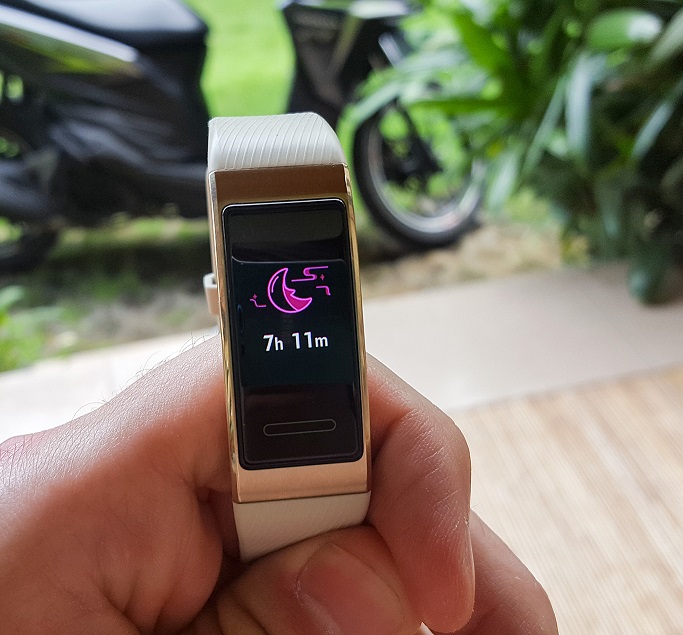 L’écran est équipé d’une dalle AMOLED de 0,95 pouces, avec un affichage de 120 x 240 pixels. La résolution est de 282 pixels par pouce. Ce n’est pas la meilleure résolution disponible sur le marché, mais c’est tout à fait correct. Les informations affichées restent lisibles dans la majorité des situations. On notera que la densité de pixels par pouces s’est améliorée par rapport à la version précédente (146 ppp sur le Huawei Band 2 Pro). La luminosité peut être réglée dans les paramètres, l’écran est suffisamment lumineux pour une utilisation en plein jour ou de nuit. Et on apprécie que l’écran puisse afficher des couleurs, car ce n’est pas le cas sur tous les bracelets connectés. Par exemple le Xiaomi Mi Band 3 utilise un écran monochrome.