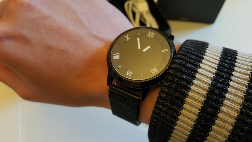 Le bracelet accroché aux boîtiers est en métal et un aimant est placé à son extrémité pour qu’il puisse. Vous enfilez le bracelet autour de votre poignet et l’aimant permet de régler la longueur suivant votre morphologie. L’aimant est puissant, une fois qu’il est fixé sur le bracelet métallique il ne glisse pas. Même si vous effectuez des mouvements dans tous les sens la montre ne bougera pas. Il suffit de bien serrer le bracelet pour que l’ensemble soit fixe. Le bracelet fait 24.50 centimètres de longueur et 2 centimètres de largeur. Le seul reproche que l’on pourrait faire c’est qu’il sera difficile pour les utilisateurs possédants de grande main d’enfiler rapidement la montre.