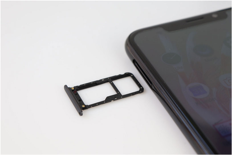 Au premier coup d’œil on remarque que le design du Oukitel C13 Pro a des points communs avec les smartphones d’Apple. À l’avant on fait face à un écran de 6,18 pouces. Les bords entourant l’écran sont fins, c’est le bord inférieur qui est le plus épais. Le constructeur a également décidé d’intégrer une encoche sur la partie supérieure de l’écran. Le téléphone est fabriqué en plastique avec une finition de couleur noir brillant. Il faudra protéger le C13 Pro avec la coque de protection fournie dans la boîte pour éviter les traces de doigt. Sur le côté droit de l’appareil, on trouve le bouton d’alimentation et le bouton du volume. Sur le côté gauche, on trouve le tiroir de la cartes SIM (ouvrable avec une petite aiguille). C’est un slot hybride, ce qui signifie que vous pouvez insérer deux carte SIM ou une carte SIM et une micro SD pour étendre la mémoire.
