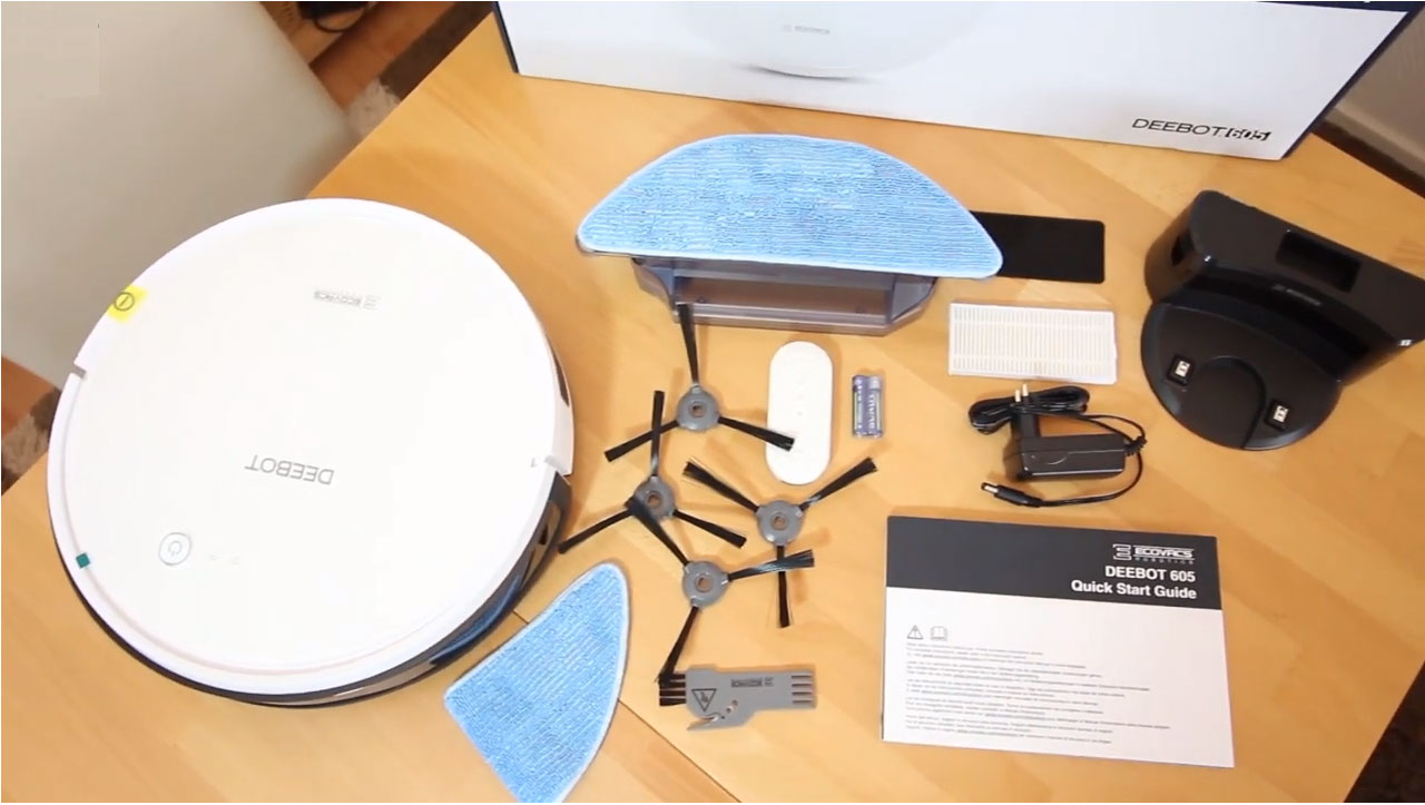 Le packaging est assez complet. Une fois que l’on a tout déballé on obtient le robot aspirateur, un guide démarrage, une petite brosse grattante pour nettoyer les filtres, des piles qui iront avec la télécommande, une serpillère de rechange, une prise électrique française, 4 brosses rotatives, un filtre HEPA à particule fine et allergène, le boitier en plastique pour le lavage des sols et la base de chargement pour la recharge automatique. En clair le constructeur a été généreux sur les accessoires. Le Deebot 605 et disponible pour 230 euros sur internet.